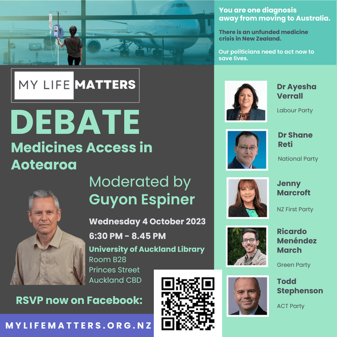 It's never been more important for the voices of patients and supporters to be heard to make sure the decisions made by the medication agency Pharmac reflect the sort of country we want to live in. If you haven't had a look at the campaign information, go here https://www.mylifematters.org.nz/. More importantly, sign up to attend the final Roadshow meeting in Auckland on 4th October where Guyon Espiner will interview 5 representatives of political parties.