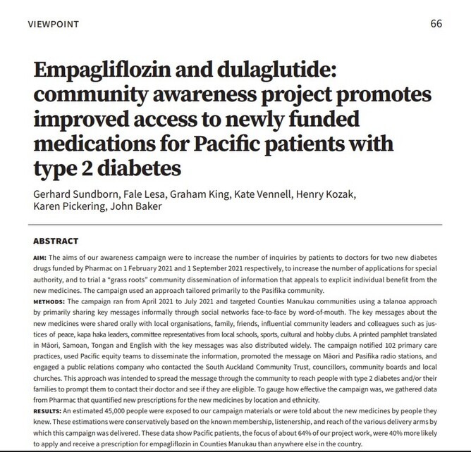 Diabetes Foundation Aotearoa community awareness project taking a practical approach to making sure that the newly funded Diabetes Type 2 medications, Empagliflozin and Dulaglutide get to where there are most needed. In 2021, Diabetes Foundation Aotearoa, with funding from Foundation North, worked with Blackland PR to design and run a campaign to increase inquiries by patients to doctors about whether the medications were a better option for them. There is more information on this project here. The results have been published in an article the NZ Medical Journal, Vol 136, No 1572, 2023 Mar 24 Edition. Congratulations Gerhard Sundborn et al on a successful project and publication of the experience.