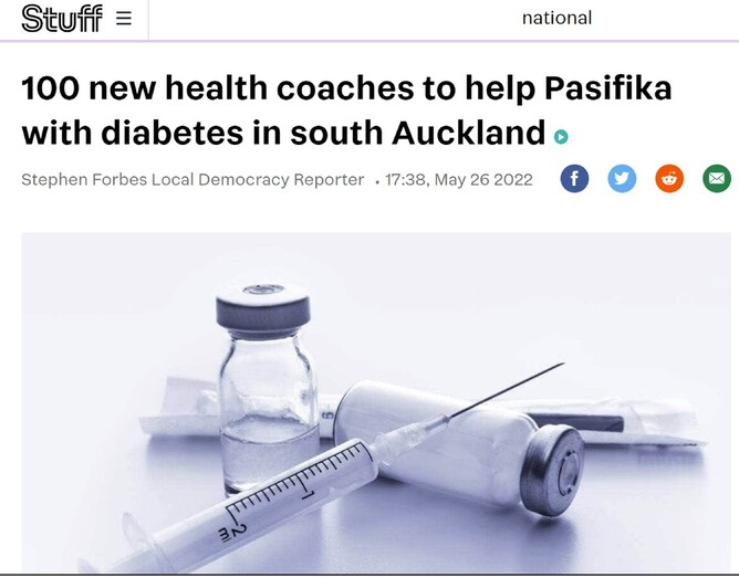 Article by Stephen Forbes, Local Democracy Reporter for Stuff, with the headline "100 new health coaches to help Pasifika with diabetes in south Auckland".