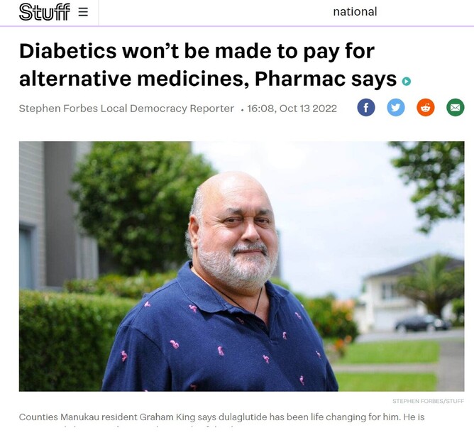 In this Stuff article by Stephen Forbes, Local Democracy Reporter, Pharmac has assured that patients won't be paying for an alternative. That's good news to Graham King (Ngāti Tai) , Diabetes Foundation Aotearoa Board member, who describes his experience with the medications concerned as "life changing", he does question whether any alternative might have different side effects.