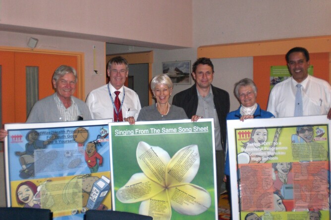 A successful trip to the NZSSD (New Zealand Society for the Study of Diabetes) conference for the DPT Team. Holding the posters, left to right, are Board members Henry Van der Heijden, John Baker, Pamela Tregonning, Tom Robinson, Faye Clark and Ngatai Smith. Two posters are on the schools programme GetWize2Health (cartoon work originals by artist Ant Sang), and one is on a train-the-trainer programme for health workers and health professionals.
