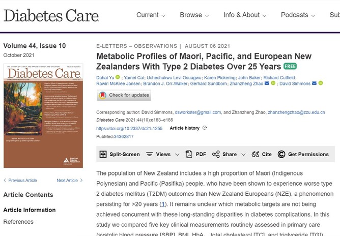 This article published in American Diabetes Association Diabetes Care has the title "Metabolic Profiles of Māori, Pacific, and European New Zealanders With Type 2 Diabetes Over 25 Years". PDF of the paper can be downloaded from the link.
