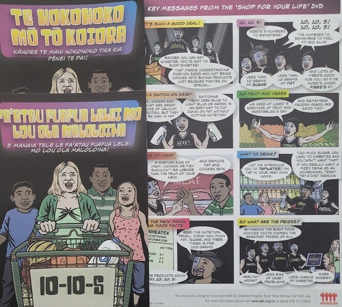 Below are samples of posters for use in schools to support messages being provided by GetWize2Health healthy schools and other health promotion programmes (Lets Beat Diabetes supported), a comic format aimed at giving basic messages about a young boy with diabetes (Tama's big day), one pagers for preventing type 2 diabetes and basic healthy living tips with type 2 (multiple translations) and comics/one pager to support the "shop for your life" video.