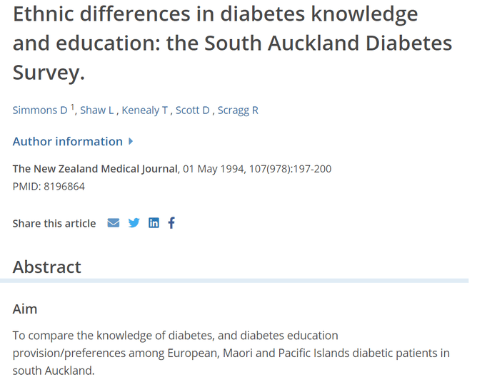 Survey carried out of diabetes knowledge looking at ethnic differences in knowledge about diabetes in South Auckland. Publication of this Paper in the NZMJ in May 1994.