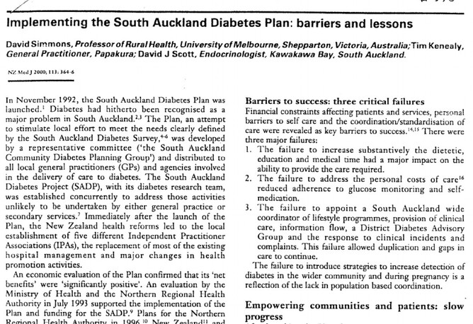 In 2000 a followup was published in The New Zealand medical journal, 113(1116):364-6 to describe what happened after the implementation of the South Auckland Diabetes plan in 1992. It's an interesting read, and even since the followup there are familiar stories and experiences repeated. David Simmons, David Scott, and Tim Kenealy.