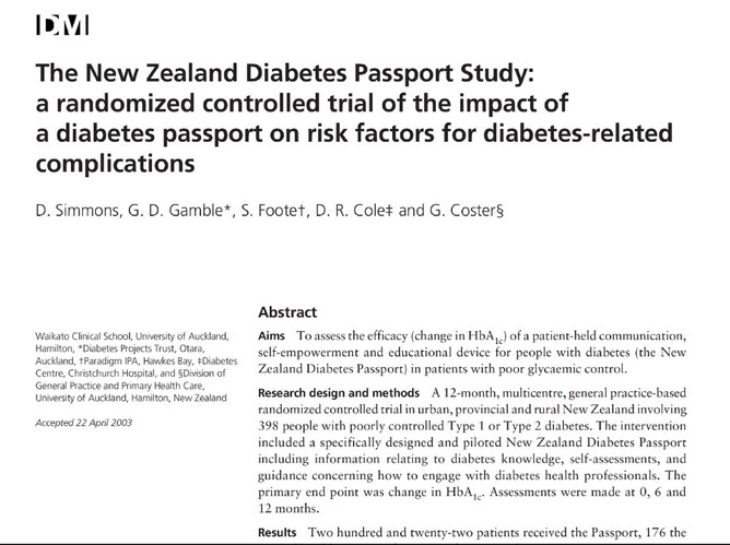 Published in Diabetic Medicine, Volume 21 (3) - March 1, 2004, this study was to assess the efficacy using a 'passport' aimed at self empowerment and education in patients with poor glycaemic control. The finding was that there weren't improvements in knowledge or self empowerment, however there was a small improvement in glycaemic control.