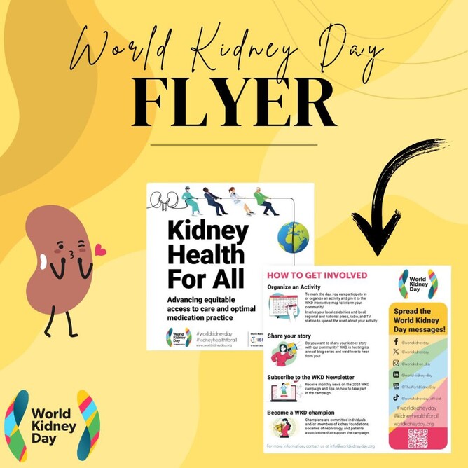 The World Kidney Day Steering Committee has set the theme for 2024 as being the year of “Kidney Health for All – Advancing equitable access to care and optimal medication practice!”. The 2024 campaign is targeted at focusing "on raising awareness about the importance of ensuring equitable access to appropriate treatment and care for people living with kidney disease, in order to improve their quality of life and delay the progression of the disease".