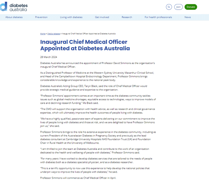Professor Simmons - Inaugural Chief Medical Officer for Diabetes Australia