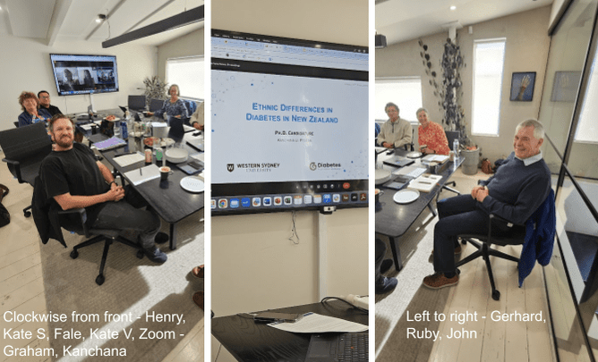 Present were Chair John Baker, and Board members Graham King, Henry Kozac, F A Lesa, Ruby McGill, Gerhard Sundborn and Kate Vennell, as well as Clinical Director Kate Smallman and manager Karen Pickering. Sincere thanks for their willingness to share their skills and experience to ensure that our 'small but mighty' (as team member Trish says!) organisation remains agile and adapts to meet our objectives in the ever changing community diabetes environment. Thanks to Kanchana Perera for a fascinating presentation updating on her progress with her PhD through Western Sydney University, with funding support from Diabetes Foundation aotearoa.