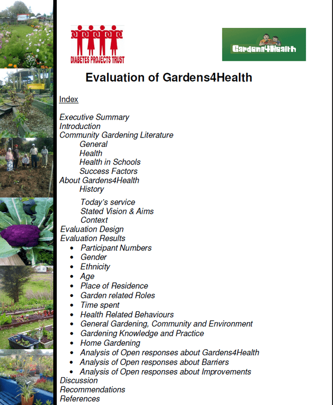 An evaluation was commissioned in 2011 as part of the routine contract for service delivery for the Gardens4Health programme. The objective of this evaluation was gaining a greater understanding around what does and doesn’t work in relation to delivery of the community gardening programme Gardens4Health. Also required was the examination of evidence around community gardens in general as a way of impacting on the health of at risk community members. The direction was for a mixed methods evaluation to include process and impact, describe the activity itself, its effect and effectiveness.