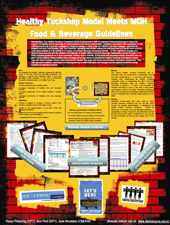 This poster presented at the IDF in 2009. The Healthy Tuckshops framework story has been long on convoluted, with work starting in select schools in South Auckland in 2005 with a resource designed using best practice, research, and hard experience in the real world of local schools. Involved were the DHB, the Lets Beat Diabetes programme, and Diabetes Projects Trust. Within the story also came a change to guidelines for schools (National Administration Guidelines) requiring trustees to provide a healthy food environment. Then a new system, the MOH new Food and Beverage guidelines came in and needed to be incorporated. This poster presents some of the experience, and offered an opportunity for questions to be asked around the practicalities of adapting to change working in the school nutrition environment.