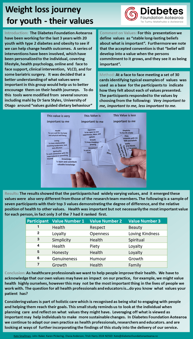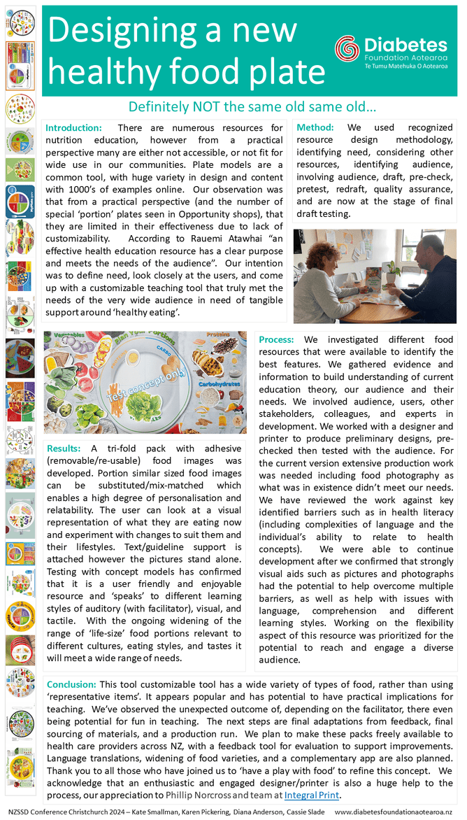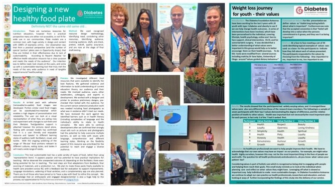 Diabetes Foundation Aotearoa had two posters and a presentation delivered by our very own team. As always it's a privilege to be able to contribute to the wider body of knowledge by sharing experiences and findings from our home-base here in Otara. Great work Kanchana for her presentation "Risk of renal disease progression in young adults with type-2-diabetes" (see separate post), and Kate and team for posters "Weight loss journey for youth, their values" and "Designing a new healthy food plate" (see pictures below). Many thanks to our Patron Professor David Simmons and Board member Ruby Mcgill for their support, also Ali and team for their usual excellent event, and the organising committee of NZSSD for the opportunity to present.
