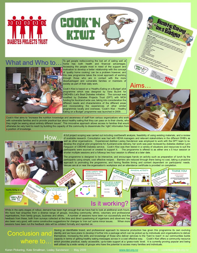 Poster put together about the Cookn'Kiwi healthy eating on a budget programme and displayed at the 2009 Middlemore Sciencefest. Authors Karen Pickering, Kate Smallman, Lesley Sanderson.