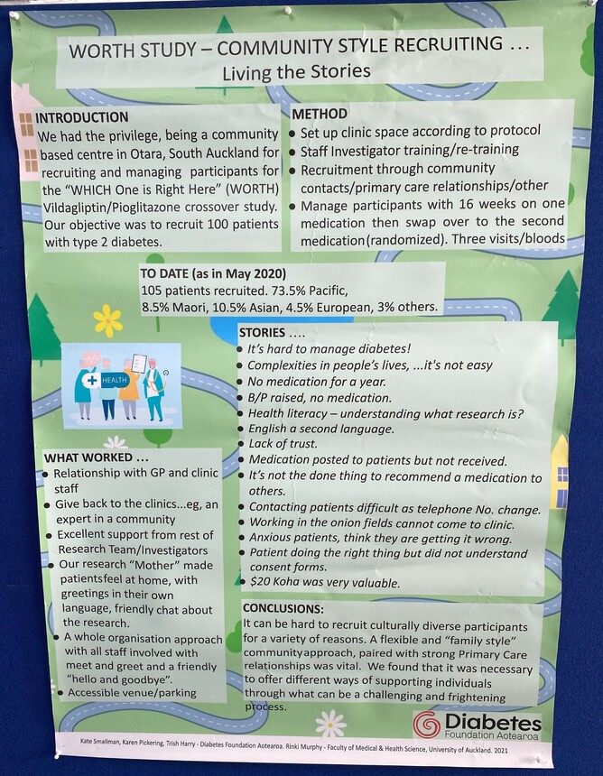 Poster describing the experience of community based recruiting for the WORTH study "Which One if Right Here" Vildagliptin and Pioglitazone crossover study. Kate Smallman, Karen Pickering, Trish Harry, Rinki Murphy.