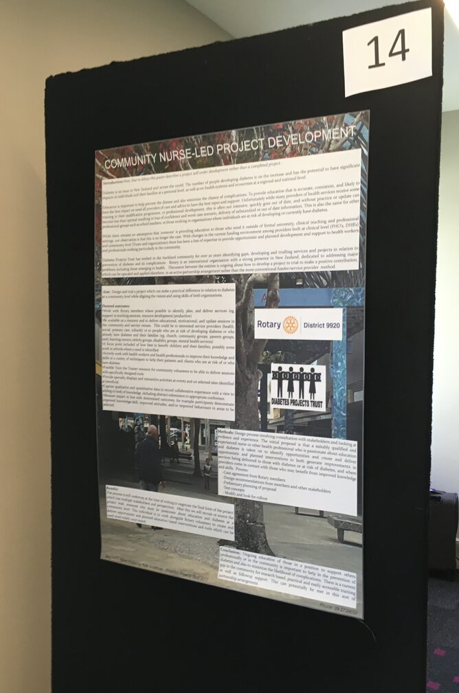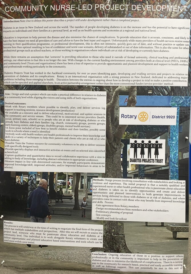 Poster presented at the 2017 NZSSD conference describing the development of a project in partnership with Rotary to make a practical difference, coming up with a resource to deliver educational, motivational and update sessions in the community. Poster authors Kate Smallman, Karen Pickering