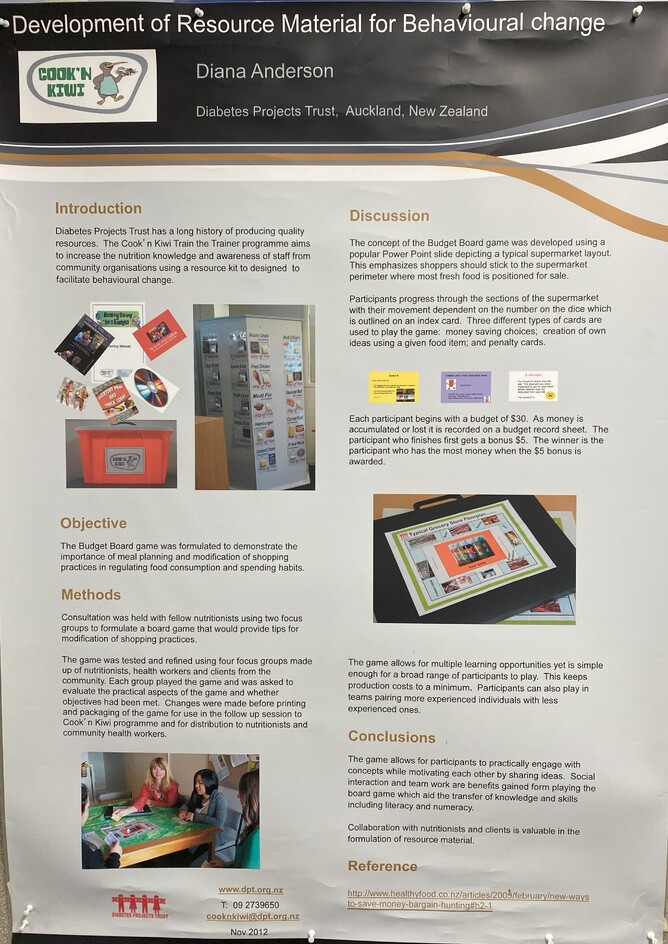 Nutritionist Diana Anderson presented this poster around development of material in 'game' format for the Cook'n Kiwi game. Poster describes the process and importance of collaboration with colleagues and users.