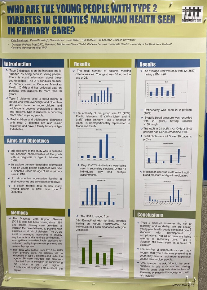 Poster at NZSSD, using DCSS data collected from primary care in the Counties Manukau Health area, describing characteristics of young people diagnosed with type 2 diabetes. This cohort had ages 16-26, 47% Pacific, 34% Māori, 18% other ethnicity. Average BMI was 35.6. A key question raised was whether individuals were being missed due to lack of screening in the age group.