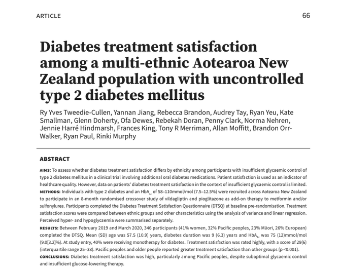 This publication follows up a multi-centre trial conducted in general practices and diabetes clinic sites across Aotearoa New Zealand, of which Diabetes Foundation Aotearoa was one (researchers on-site Kate Smallman and Patricia Harry). The study was led by Rinki Murphy, our Clinical Director at the time, and included both urban and rural regions. The aim for this part of the study was to "assess whether diabetes treatment satisfaction differs by ethnicity among participants with insufficient glycaemic control of type 2 diabetes mellitus in a clinical trial involving additional oral diabetes medications. Patient satisfaction is used as an indicator of healthcare quality". The Diabetes Treatment Satisfaction Questionnaire (DTSQ) was used. Published in New Zealand Medical Journal, Te ara tika o te hauora hapori, 2024 Aug 2; 137(1600). ISSN 1175-8716. https://www.nzmj.org.nz/
