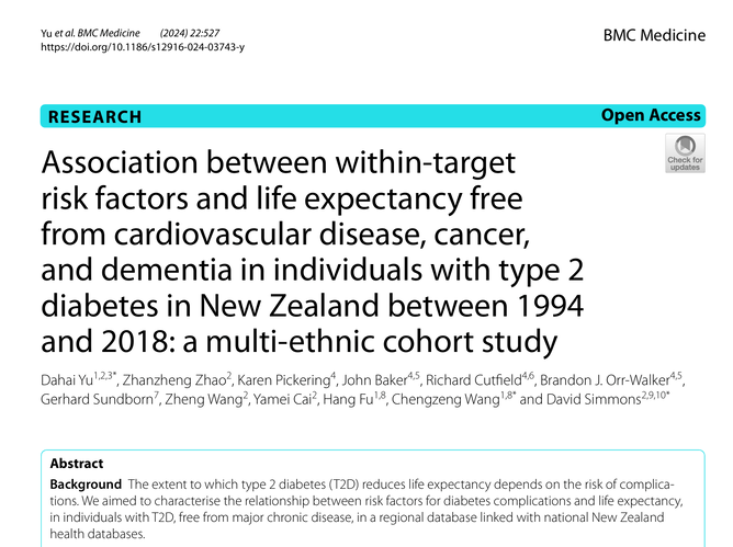 Another paper from the DCSS Audit. This one published in BMC Medicine Yu et al. BMC Medicine (2024) 22:527, read latest version here https://doi.org/10.1186/s12916-024-03743-y or download PDF below. The full title is "Association between within-target risk factors and life expectancy free from cardiovascular disease, cancer, and dementia in individuals with type 2 diabetes in New Zealand between 1994 and 2018: a multi-ethnic cohort study". Congratulations to Dahai Yu, Zhanzheng Zhao, Karen Pickering, John Baker, Richard Cutfeld, Brandon J. Orr-Walker, Gerhard Sundborn, Zheng Wang, Yamei Cai, Hang Fu1, Chengzeng Wang and David Simmons for the terrific analysis of this important data collected by Diabetes Foundation Aotearoa team members from Primary Care in Auckland.