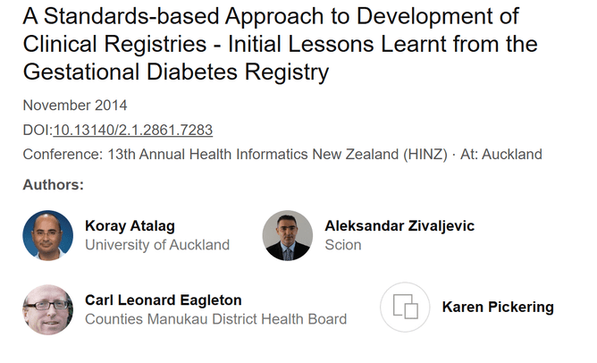 Diabetes Projects Trust supported groundbreaking work on a pilot registry for women with Gestational Diabetes. Koray Atalag, Aleksandar Zivaljevic, Carl Eagleton and Karen Pickering are authors on this paper "A Standards-based Approach to Development of Clinical Registries - Initial Lessons Learnt from the Gestational Diabetes Registry" which went to the 13th Annual Health Informatics NZ (HINZ) conference in Auckland in 2014. Abstract text is as follows