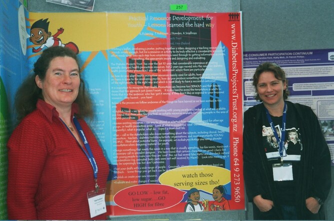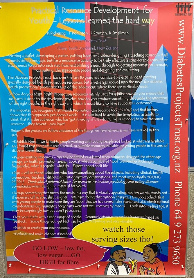 Karen and Kate took a new approach to their poster for the Australian diabetes conference in August. Lots of colour and illustration, and a triptych design in order to share our experience of working with youth, including design of the GetWize2Health programme and specialty resources. Authors Karen Pickering, Kate Smallman, Tom Robinson and Judy Rowden. Original cartoon characters by Ant Sang.