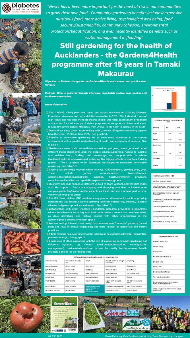Gardens4Health started thanks to the Counties Manukau DHB back in 2009. Diabetes Foundation Aotearoa (then Diabetes Projects Trust) took the project, with just two gardens back then, on and prepared it for rolling out across Tamaki Makaurau. We have presented on the progress over the years at various conferences and seminars, and this time we went back to NZSSD to give a taster about what had changed in the intervening years. Karen Pickering presented an e-poster and oral poster on behalf of the Gardens4Health team, Ali McGill, Tania Bromley and Hari Narayan.