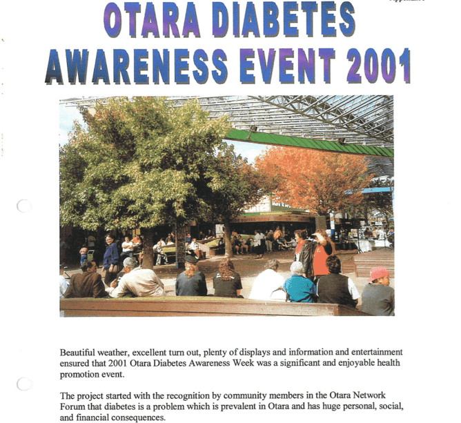 The 2001 Otara Diabetes Awareness week was held in the Town Centre as a results of planning from the November 2000 Otara network forum. The aim was to "increase diabetes awareness in the Otara community with prevention activities designed and run by the community". A long list of organisations participated and made the event possible including sponsors, Hubbards Food Products, Johnson & Johnson Pacific, Roche Diagnostics and the Otara Community Board.