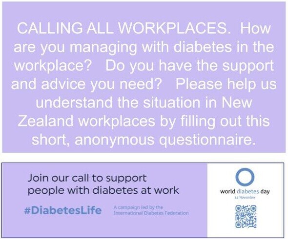 World Diabetes Day (WDD) is on the 14 of this month. The theme is diabetes in the workplace, and community organisations Diabetes Foundation Aotearoa, MHT Diabetes Trust, Diabetes Christchurch and Diabetes Wellington have worked on a mini-toolkit to help businesses. One thing identified as part of the collaboration between organisations was that it would be a good idea to learn more about the current situation in workplaces in our own areas and the wider country. This confidential questionnaire is for any workplace/business/organisation, and can be filled in by any person interested in the topic of diabetes relating to the workplace. https://forms.gle/yLhpbvNDayEBZFza9