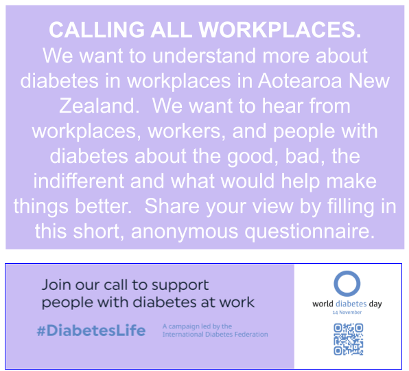World Diabetes Day (WDD) is on the 14 of this month. The theme is diabetes in the workplace, and community organisations Diabetes Foundation Aotearoa, MHT Diabetes Trust, Diabetes Christchurch and Diabetes Wellington have worked on a mini-toolkit to help businesses. One thing identified as part of the collaboration between organisations was that it would be a good idea to learn more about the current situation in workplaces in our own areas and the wider country. This confidential questionnaire is for any workplace/business/organisation, and can be filled in by any person interested in the topic of diabetes relating to the workplace. https://forms.gle/yLhpbvNDayEBZFza9