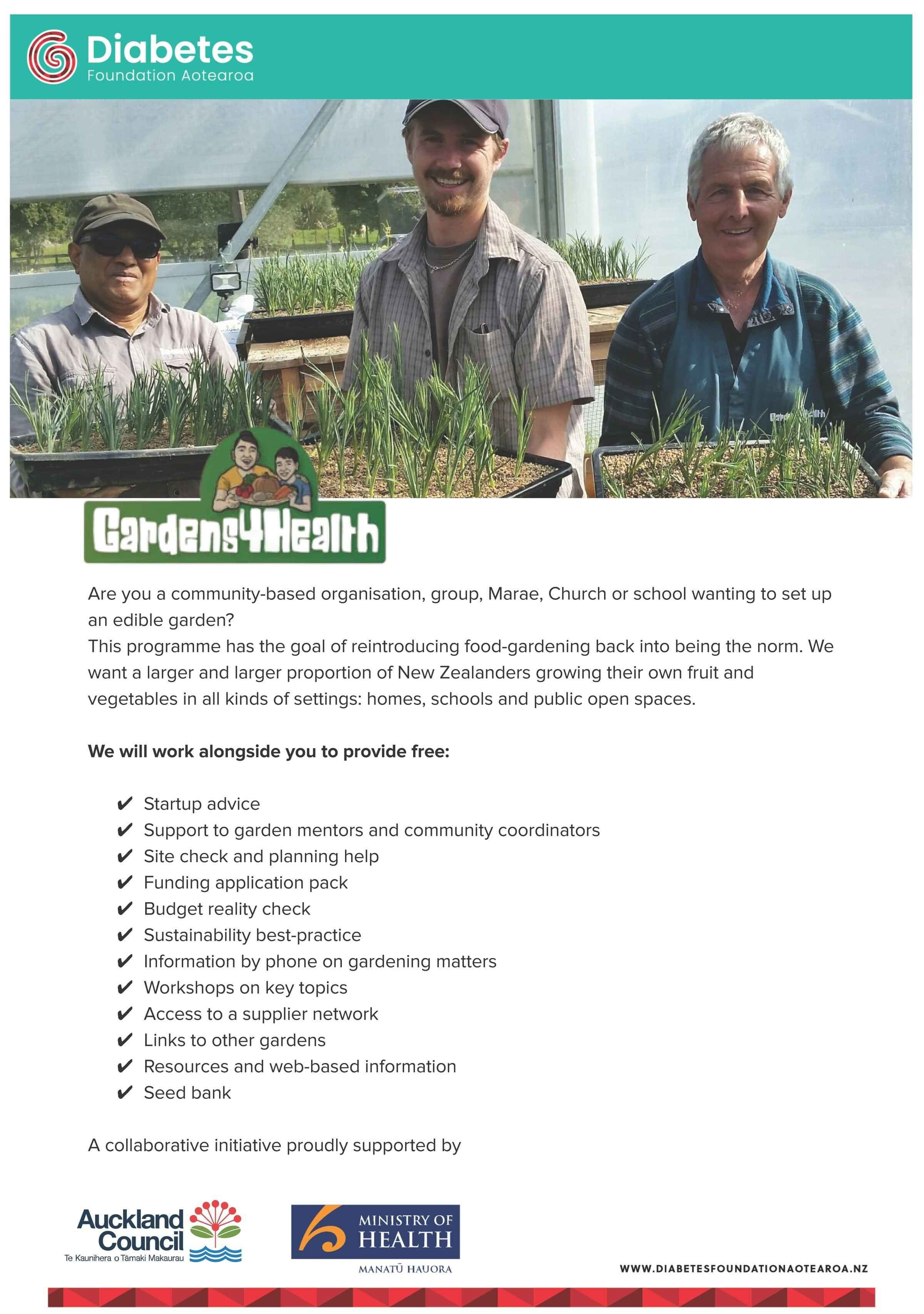Being a gardening expert is not required, but a group with time, enthusiasm, and commitment are. The experienced Gardens4Health team are there to provide practical advice and support for all seasons of food gardening in Auckland conditions.